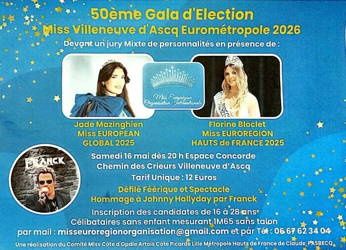 Le 50ème Gala d’Élection Miss Villeneuve d’Ascq Eurométropole 2026 promet une soirée exceptionnelle. Organisé devant un jury mixte composé de personnalités, l’événement accueillera notamment Jade Mazinghien, Miss European Global 2025, et Florine Bloclet, Miss Eurorégion Hauts-de-France 2025.